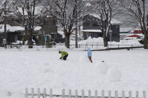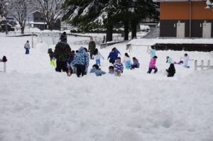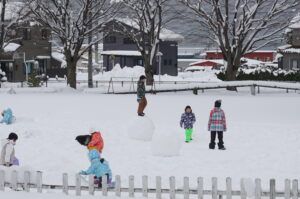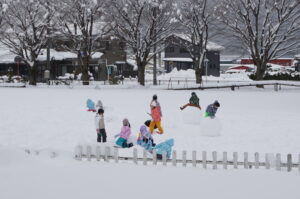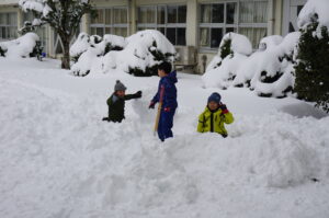 先週から降り続いた雪がグラウンド一面に積もり、午前中に2年生、午後から3年生が雪遊びをしていました。大きな山や球を友達と作って楽しんでいました。