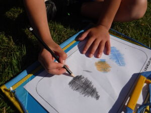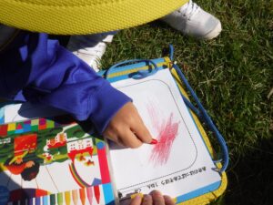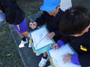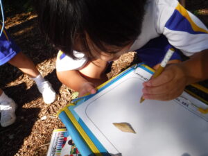 紙の下に落ち葉を置き、紙の上から色鉛筆でこすると葉の形が浮かび上がります。
