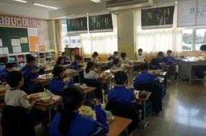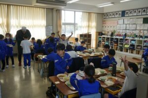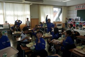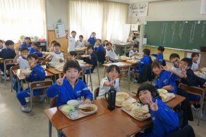 3・4年生の給食の様子を見てきました。今日のメニューは、ソフト麵、牛乳、きんとんパイ、ブロッコリーのごまだれ、五目あんかけでした。みんな自分の食べられる量をおいしそうに食べていました。