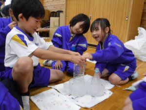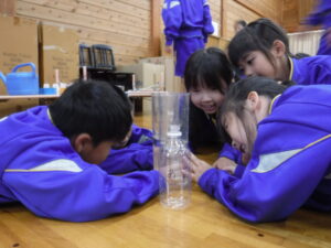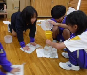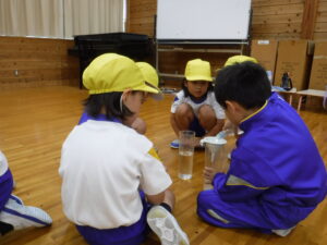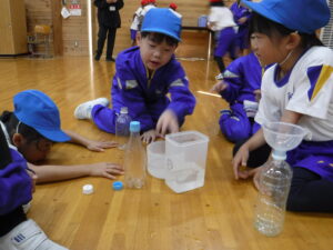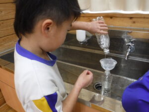 ペットボトルに入れた水を容器に入れ替えるなどして、いろいろな比べ方を試しました。