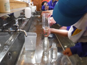 2本のペットボトルを用意し、どちらに多く水が入るかを比べました。