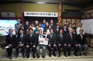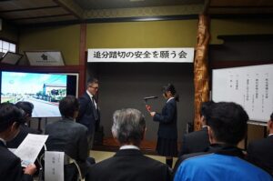 通学路点検で要対策箇所となっている追分踏切の前後区間に、路肩のカラー舗装と転落防止柵が設置され、子供たちの登下校の際の安全性が格段に向上することとなりました。多くの来賓や地域の方が集まった会合で、地域住民を代表して本校の6年生が感謝の気持ちを述べました。お家の方と一緒に参加してくれた東部っ子もいました。