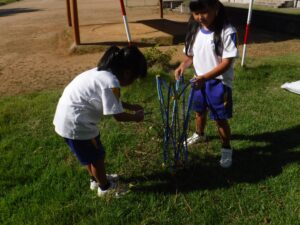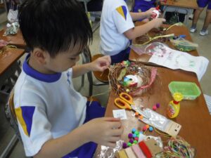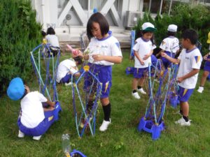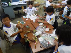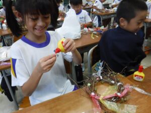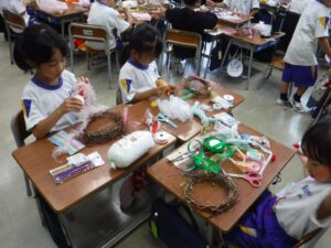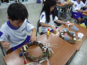 伸びたつるが絡まってほどくのに苦労していた子供たちでしたが、友達と協力して素敵なリースが完成しました。