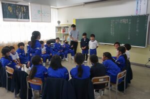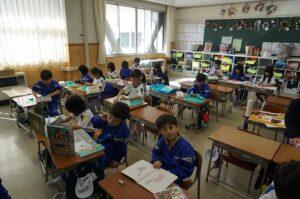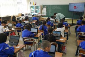 4限目の授業では、1年生がタブレットを使った問題演習と図工の作品作りに、4年生は学級での話し合いと算数の作図に取り組んでいました。
