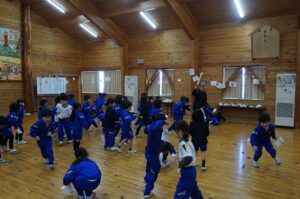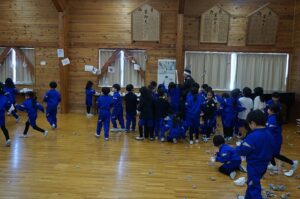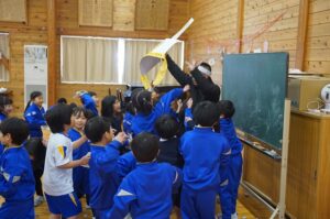 今日は節分ということで、3限目に1年生が豆まきを行いました。豆の代わりに小さく丸めた新聞紙を多目的に貼られた鬼の絵に「鬼は外、福は内」と大きな声で言いながら投げました。そこへ教頭先生が鬼として登場し、1年生は大喜び!全員で鬼を追い払い、ニコニコ笑顔で福を招き入れました。
